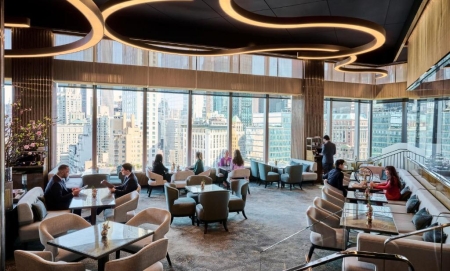 For dining, the MO Lounge serves contemporary American cuisine, creative cocktails, and offers wall-to-wall windows overlooking Central Park and the Manhattan skyline — a perfect spot for a refined lunch or a sunset drink.