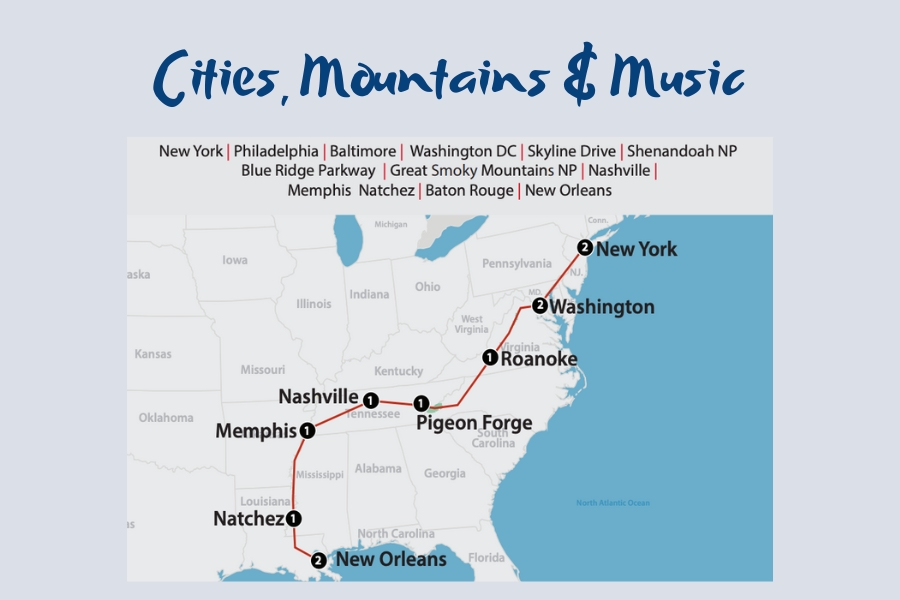 New York – Philadelphia – Baltimore – Washington DC – Shenandoah National Park – Blue Ridge Parkway – Great Smoky Mountains – Nashville – Memphis – Natchez – Baton Rouge – New Orleans