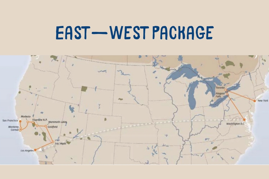 The journey begins in New York City with a guided city tour, continues to the majestic Niagara Falls and vibrant Toronto, and then reaches the U.S. capital, Washington, D.C.. A domestic flight connects the East Coast to the West Coast, where the adventure continues through Los Angeles, Las Vegas and the great National Parks of the American West.